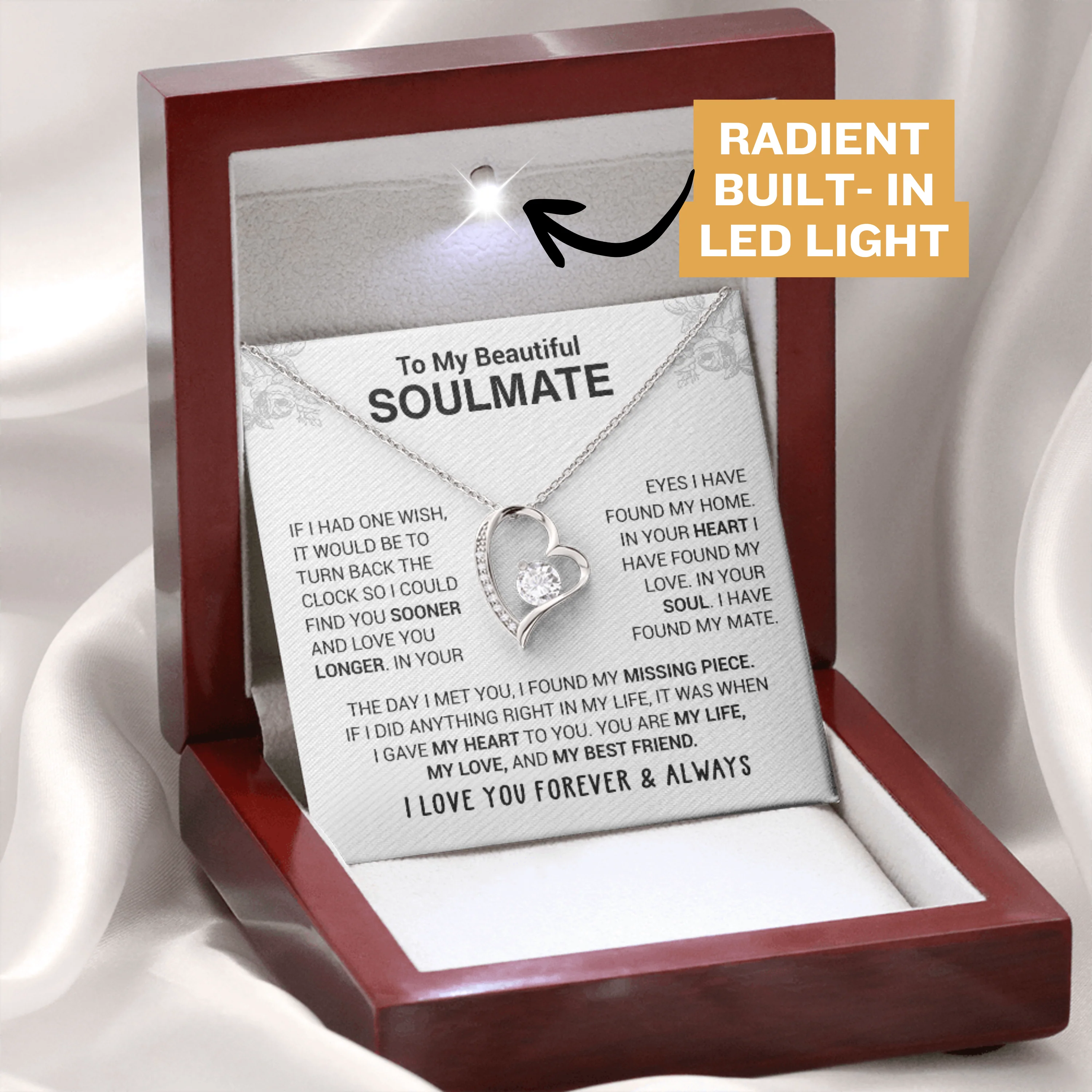 The Message Says: “To My Beautiful Soulmate – If I had one wish, it would be to turn back the clock so I could find you sooner and love you longer. In your eyes, I have found my love. In your soul, I have found my mate. The day I met you, I found my missing piece. If I did anything right in my life, it was when I gave my heart to you. You are my life, my love, and my best friend. I love you forever and always.”